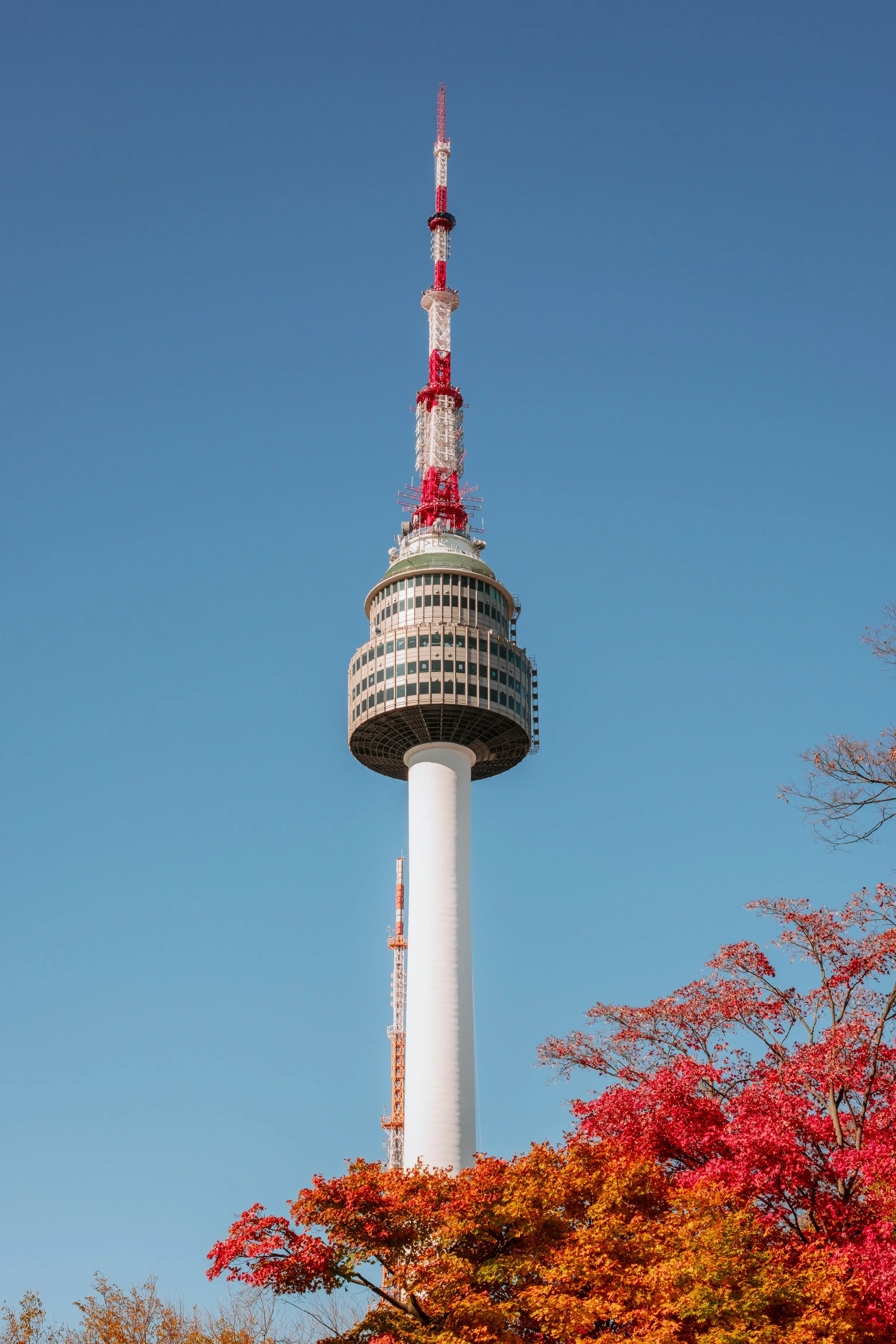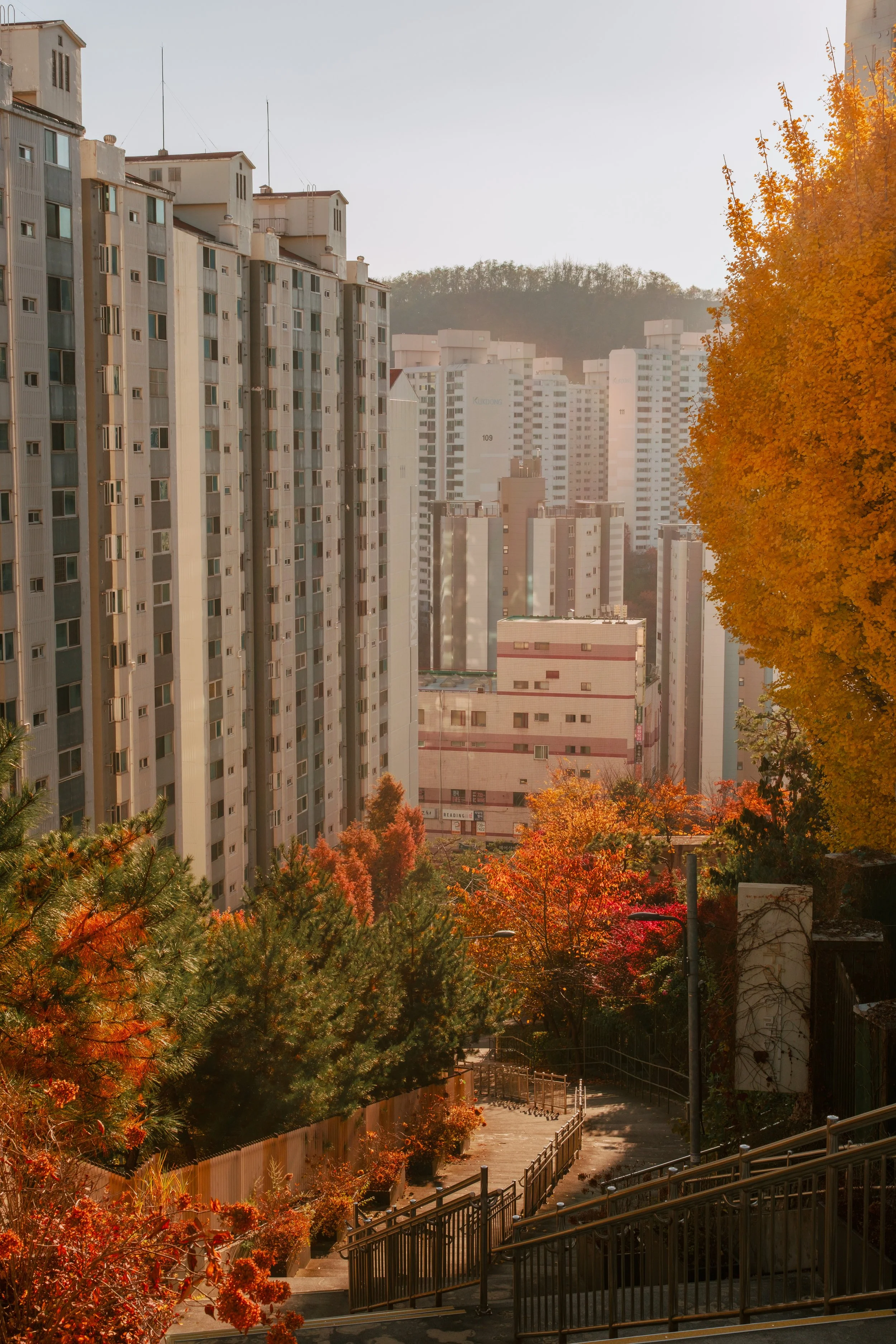 Den letzten Tag unserer Reise beginnen wir frühmorgens beim Berg Namsan. Leuchtend gelbe und rote Herbstbäume säumen den Pfad und begleiten uns bis zum Namsan Tower am Gipfel des Berges, von dem aus sich uns eine weite Aussicht über die Skyline Seouls öffnet.